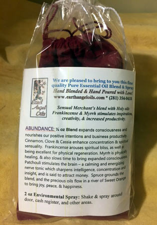 A sensual merchant's blend and environmental spray that contains ancient healing Holy oils Frankincense and Myrrh, in Handmade Gift Bag with Paperwork.