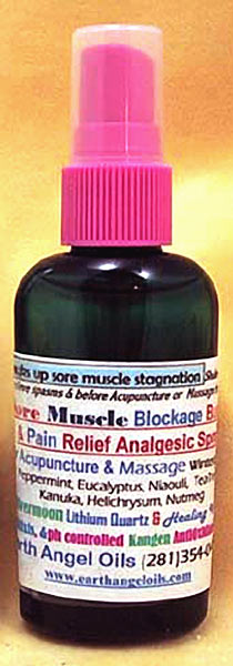The pain-relieving body spray contains the Sore Muscle/Blockage Buster essential oil blend in pH-controlled water, with Lithium Quartz and Healing Waters Gem Elixirs.
